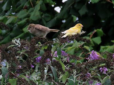 The Fife Canary was back in the garden today. It started off feeding on the spilt Nyjer seeds below the feeders, then flew up and started picking away at the seeds in the Buddleia, before heading off to another garden.