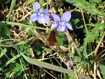 A Dark-edged Bee-fly (Bombylius major) about to land on this Common Dog Violet (Viola riviniana)