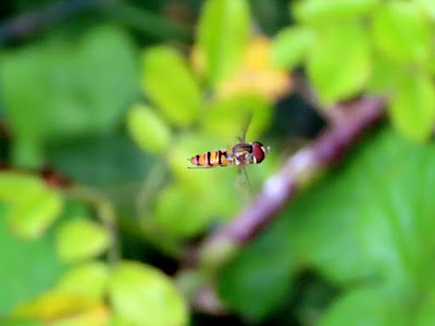 A Marmalade Hoverfly Episyrphus balteatus hovering and actually keeping very steady for the camera.